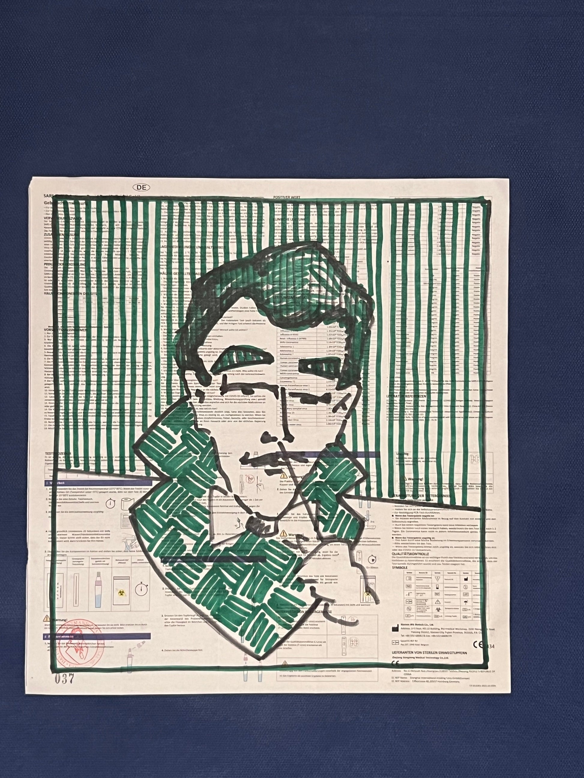 Eine Zeichnung des sich selbst testenden Coronatestmann mit Edding in Dunkelgrün und Schwarz auf dem Beipackzettel eines Corona-Antigentests. Dieses Original ist signiert sowie datiert im März 2021 und trägt die fortlaufende Nummer 037.