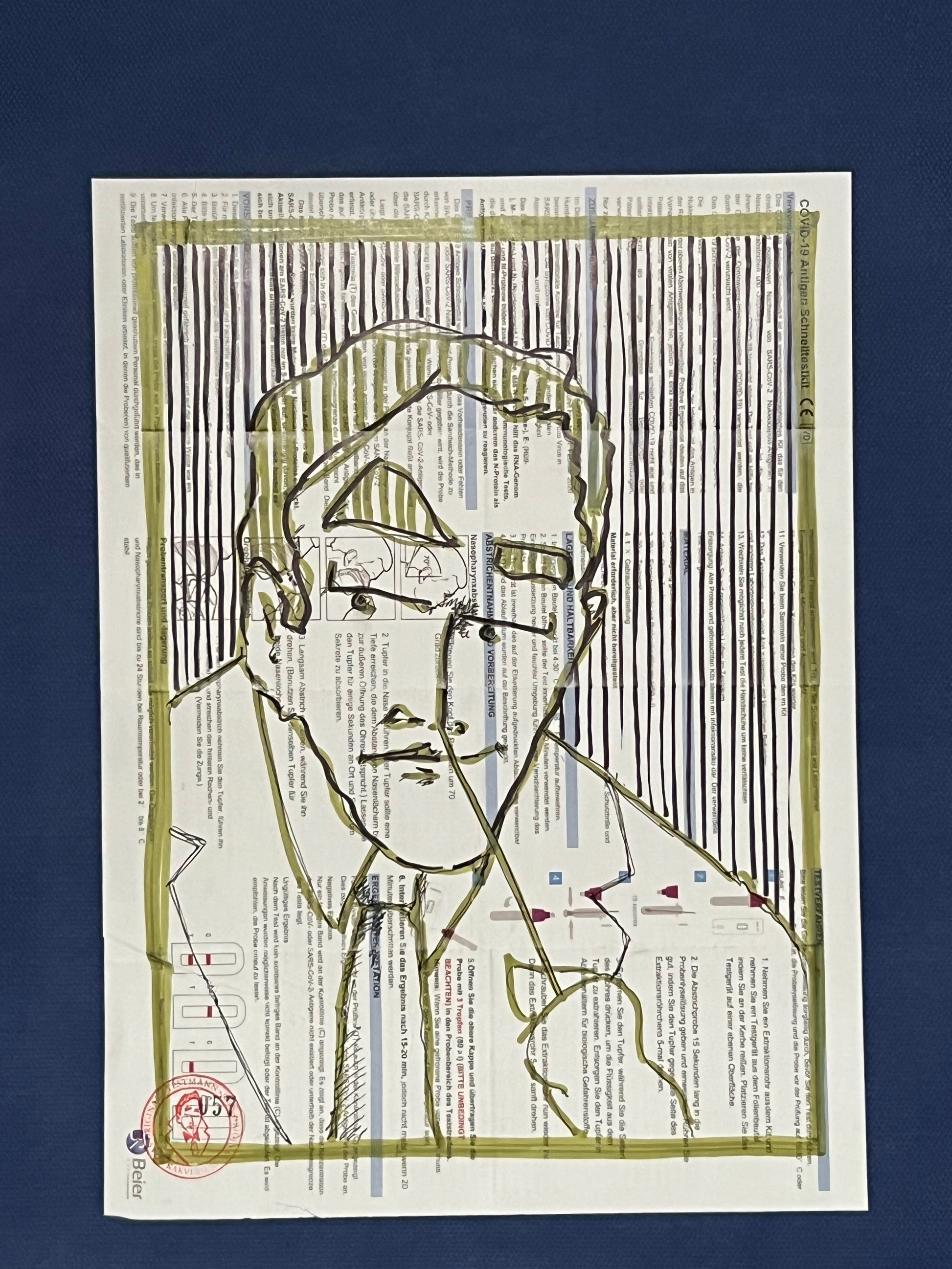 Eine Zeichnung des sich selbst testenden Coronatestmann mit Edding und Fineliner in Olivgrün und Schwarz auf dem Beipackzettel eines Corona-Antigentests. Dieses Original ist signiert sowie datiert im April 2021 und trägt die fortlaufende Nummer 057.