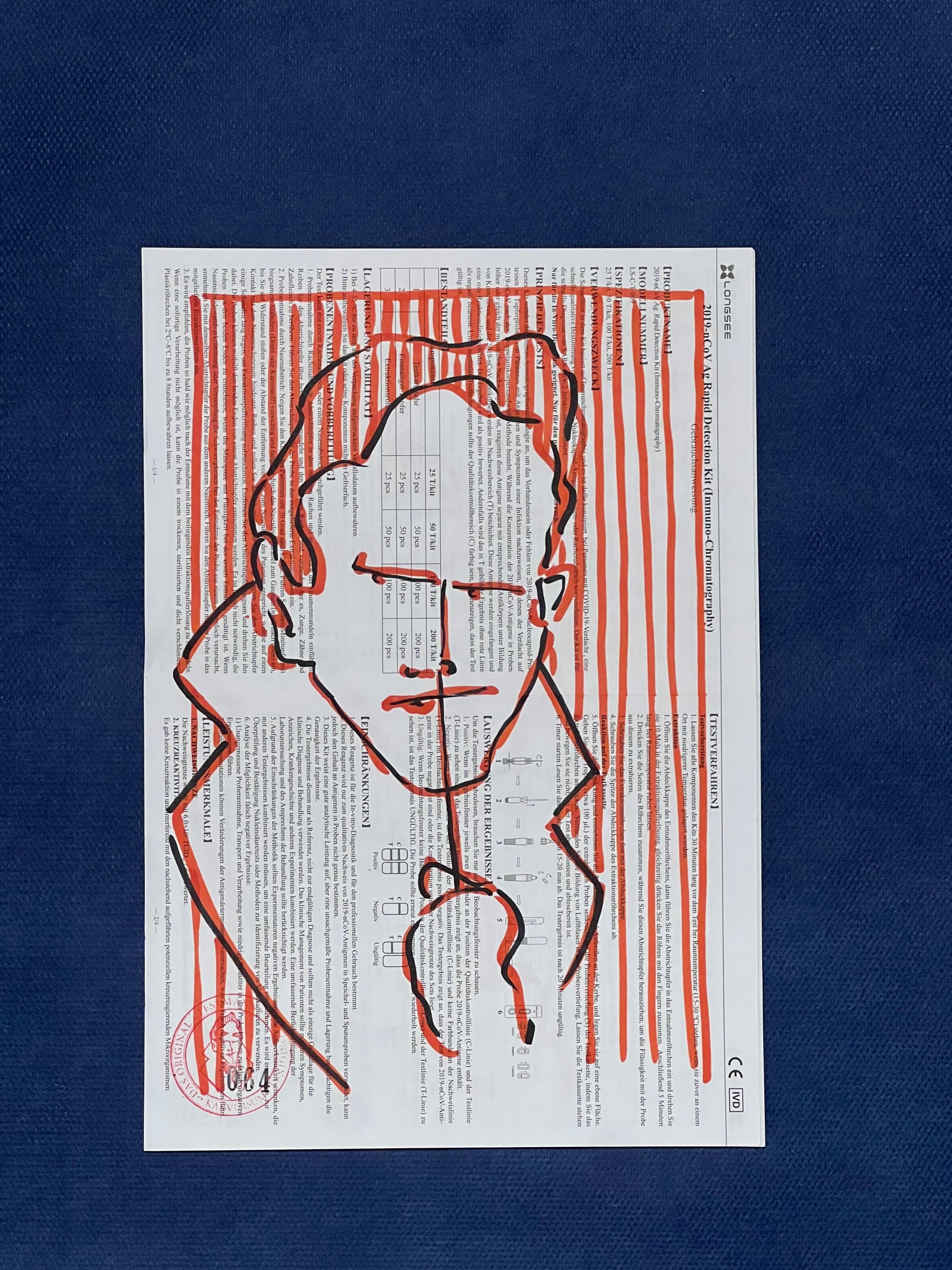 Eine Zeichnung des sich selbst testenden Coronatestmann mit Edding in Orange und Schwarz auf dem Beipackzettel eines Corona-Antigentests. Dieses Original ist signiert sowie datiert im April 2021 und trägt die fortlaufende Nummer 064.