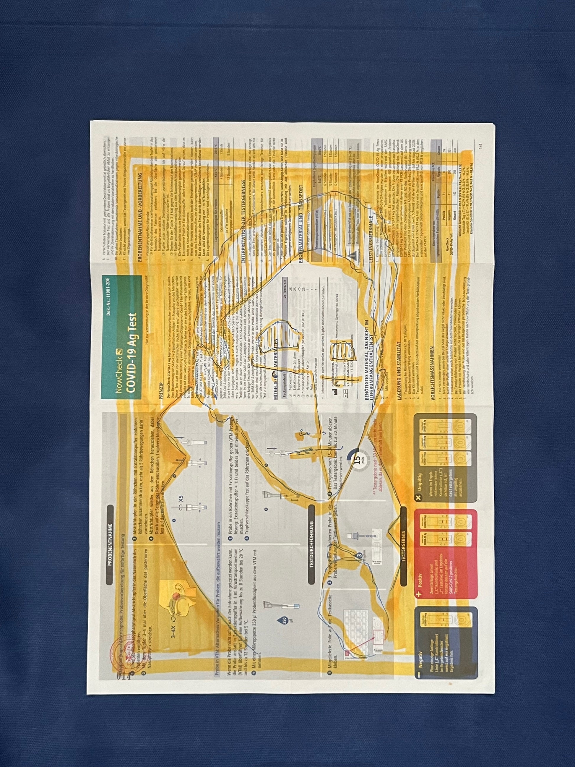 Der sich selbst testende „Coronatestmann 14“ in Gelb. Originalzeichnung mit Edding auf dem Beipackzettel eines Corona-Antigentests. Signiert und datiert im November 2020, trägt die Nummer 014.