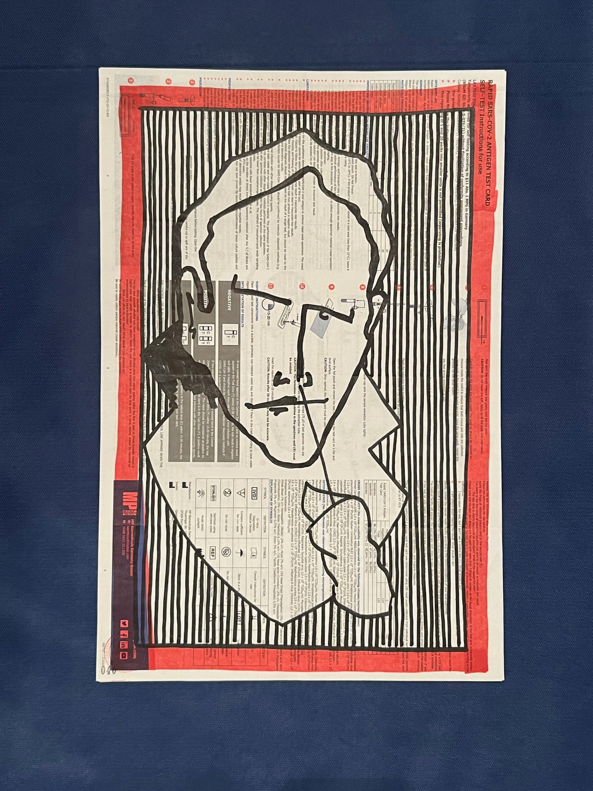 Eine Zeichnung des sich selbst testenden Coronatestmann mit Edding in Rot und Schwarz auf dem Beipackzettel eines Corona-Antigentests. Dieses Original ist signiert sowie datiert im März 2021 und trägt die fortlaufende Nummer 040.