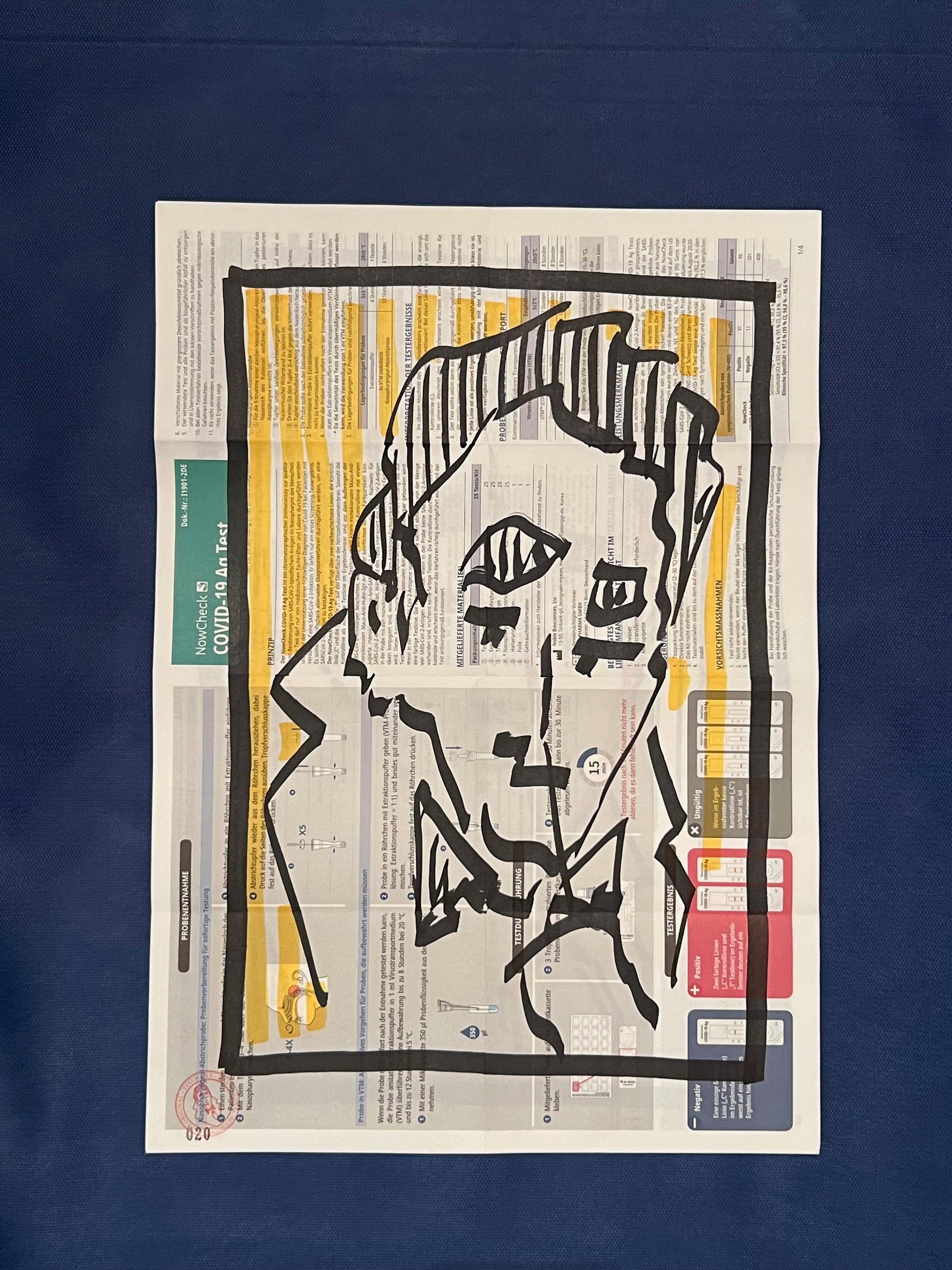 Eine Zeichnung des sich selbst testenden Coronatestmann mit Edding in Gelb und Schwarz auf dem Beipackzettel eines Corona-Antigentests. Dieses Original ist signiert sowie datiert im November 2020 und trägt die fortlaufende Nummer 020.
