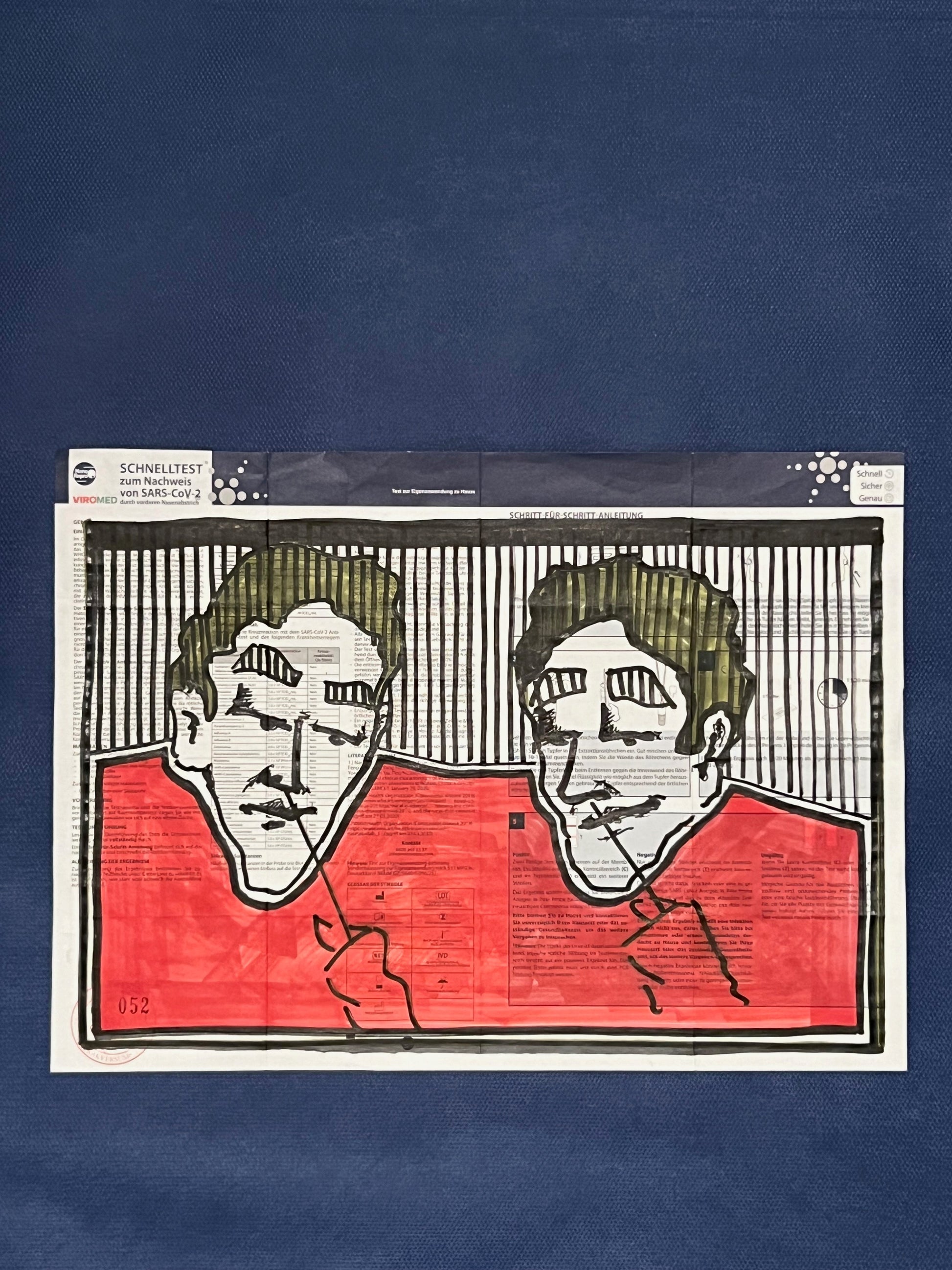Eine Zeichnung des sich selbst testenden Coronatestmann mit Edding und Fineliner in Olivgrün, Schwarz und Rot auf dem Beipackzettel eines Corona-Antigentests. Dieses Original ist signiert sowie datiert im März 2021 und trägt die fortlaufende Nummer 052.