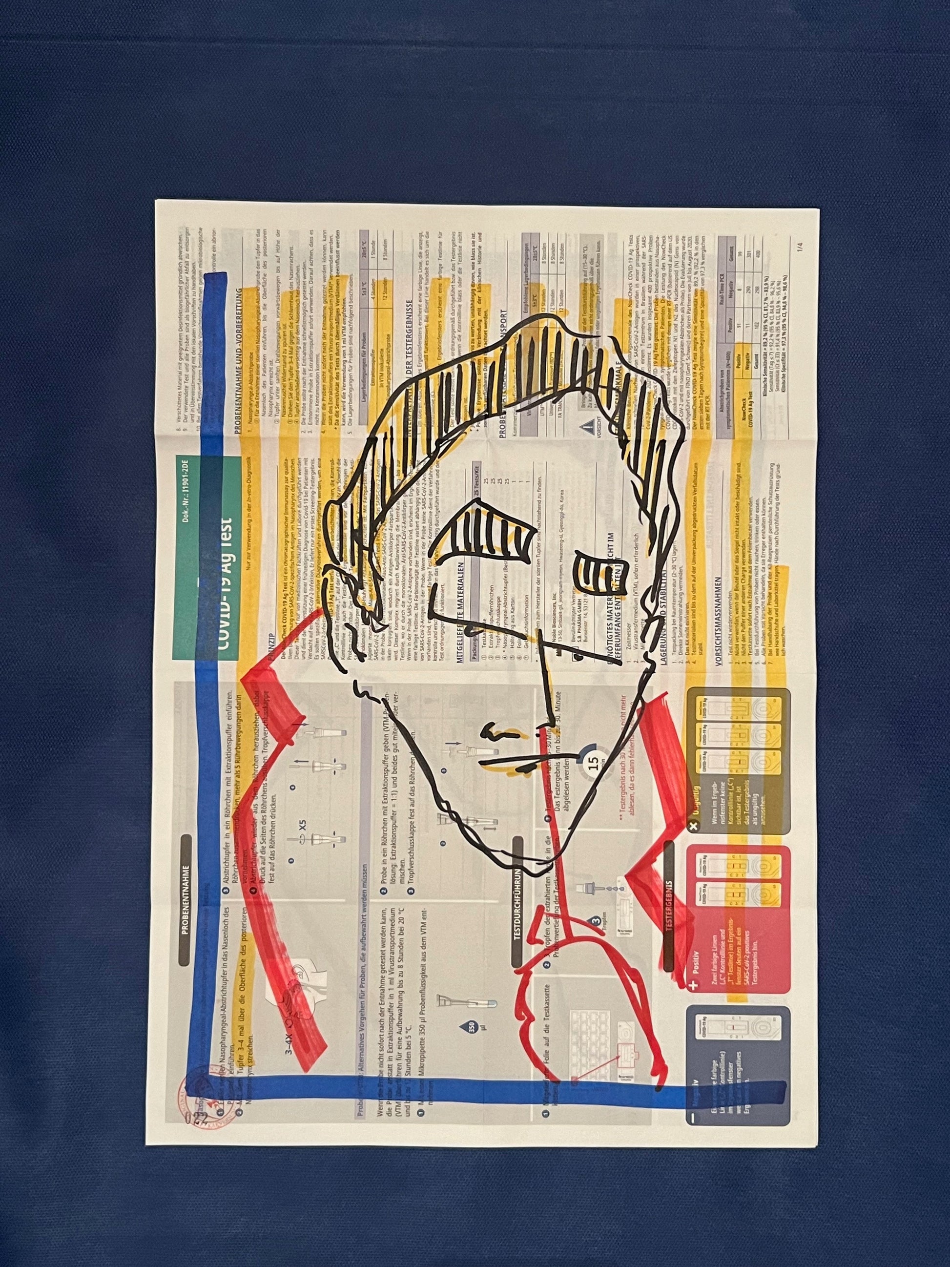 Eine Zeichnung des sich selbst testenden Coronatestmann mit Edding in Rot, Gelb, Dunkelblau und Schwarz auf dem Beipackzettel eines Corona-Antigentests. Dieses Original ist signiert sowie datiert im November 2020 und trägt die fortlaufende Nummer 022.