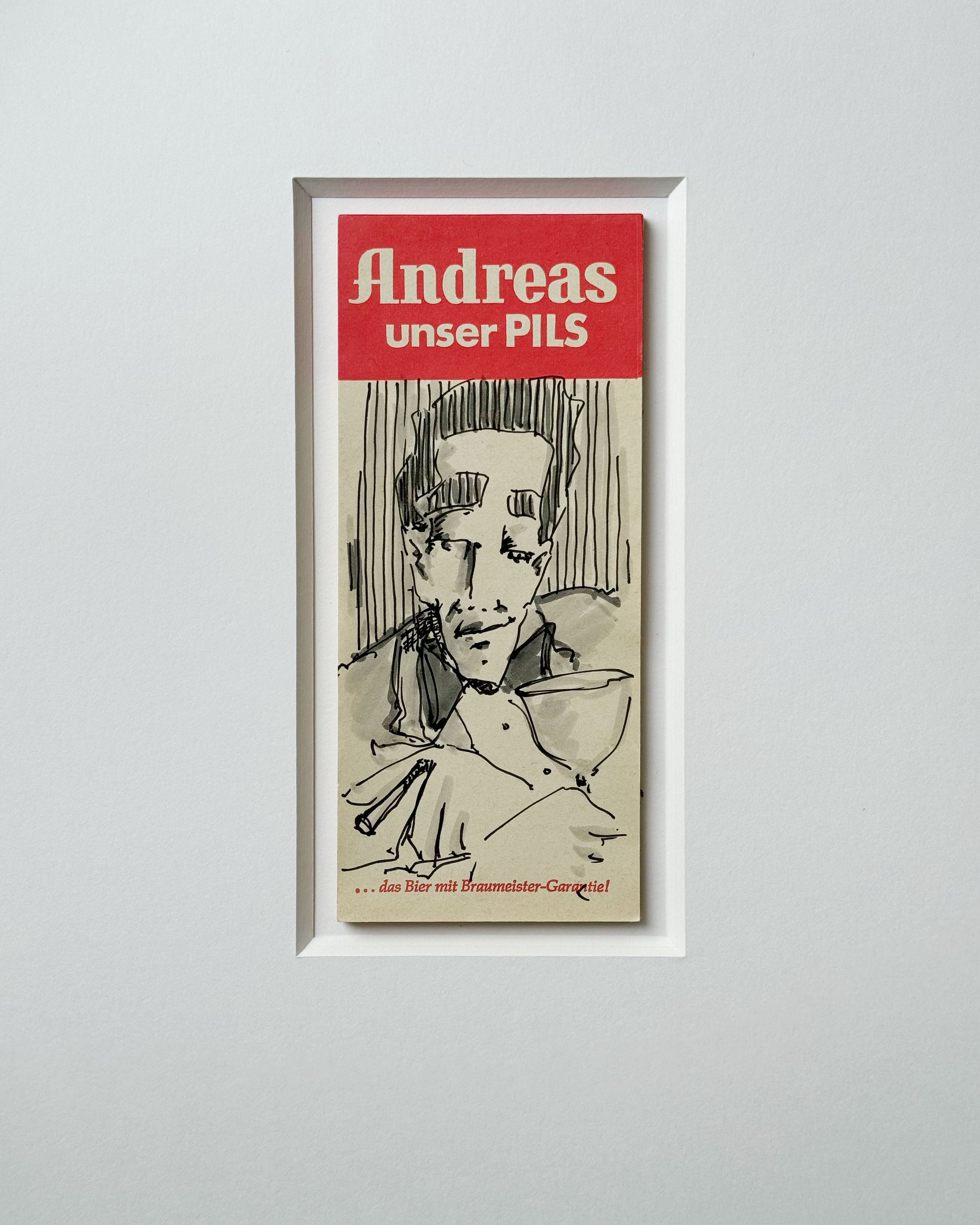Eine Originalzeichnung von Karl Anton Koenigs. Auf einem Kellnerblock von Andreas unser Pils. Eingefasst ist der Kellnerblock in einem 3mm Starken Klapppassepartout in Altweiss mit einer Grösse von 24 x 30 cm.