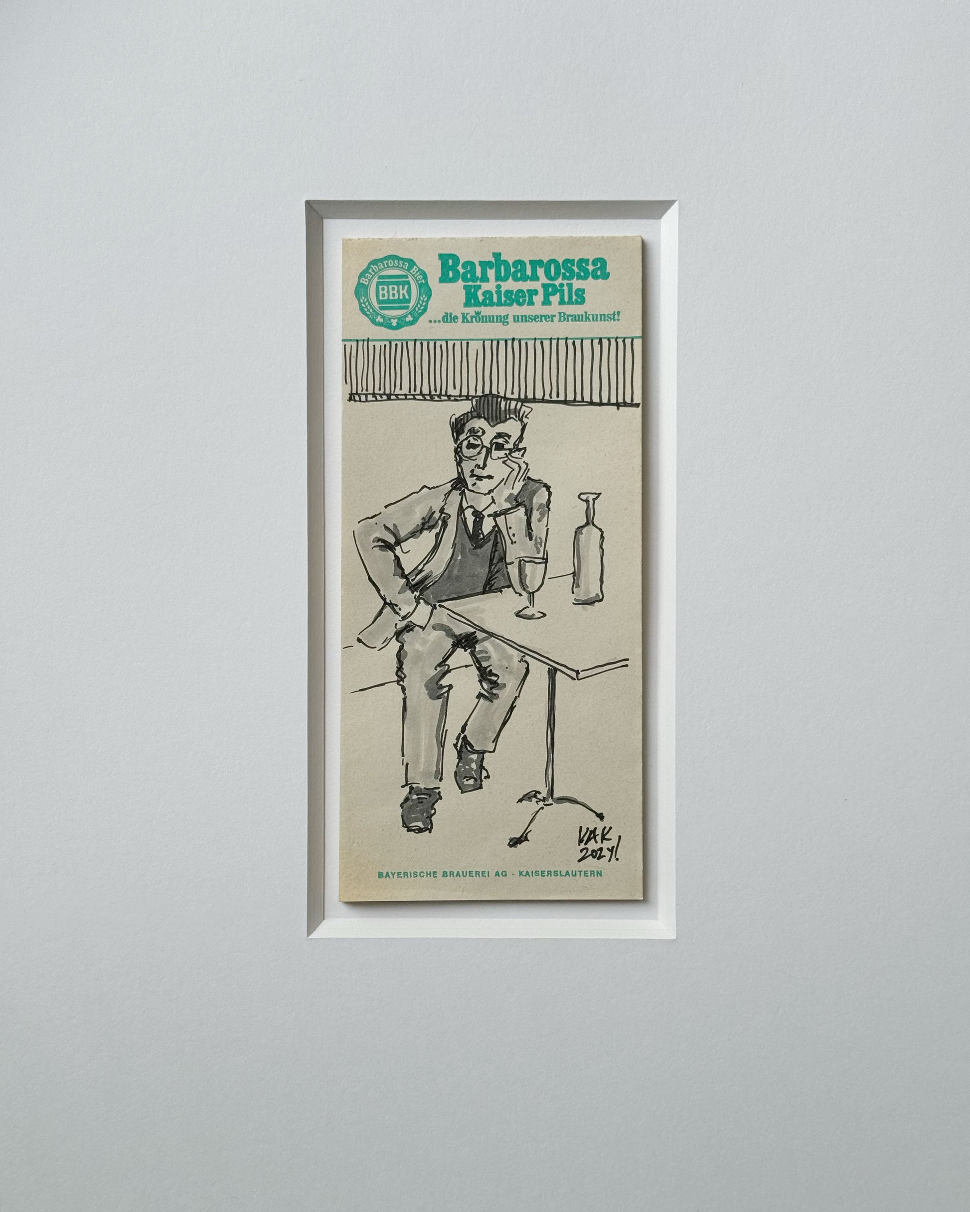 Eine Originalzeichnung von Karl Anton Koenigs. Auf einem Kellnerblock von Barbarossa Kaiser Pils. Eingefasst ist der Kellnerblock in einem 3mm Starken Klapppassepartout in Altweiss mit einer Grösse von 24 x 30 cm.