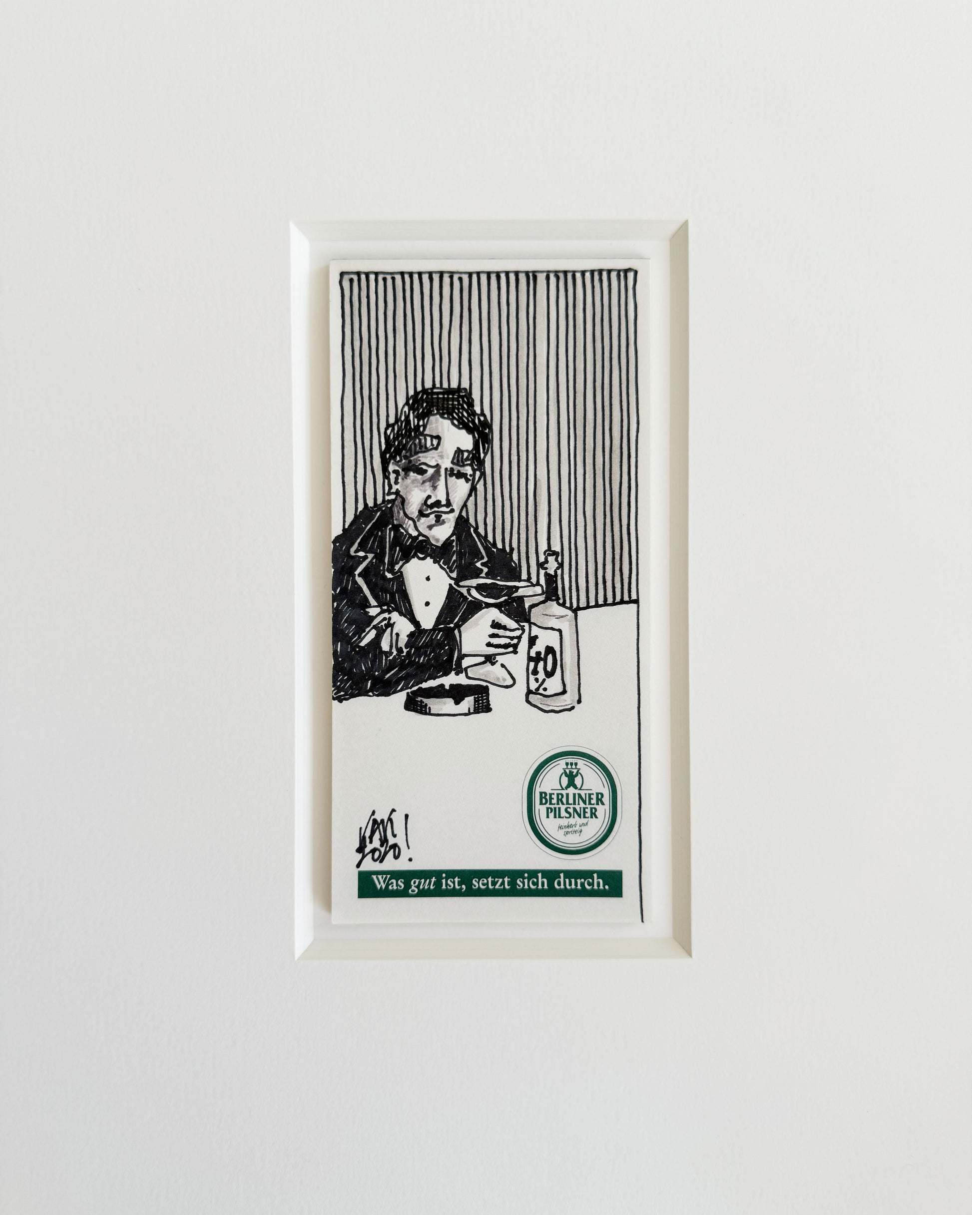Eine Originalzeichnung von Karl Anton Koenigs. Auf einem Kellnerblock von Berliner-Pilsner. Eingefasst ist der Kellnerblock in einem 3mm starken Klapppassepartout in Altweiss mit einer Grösse von 24 x 30 cm.