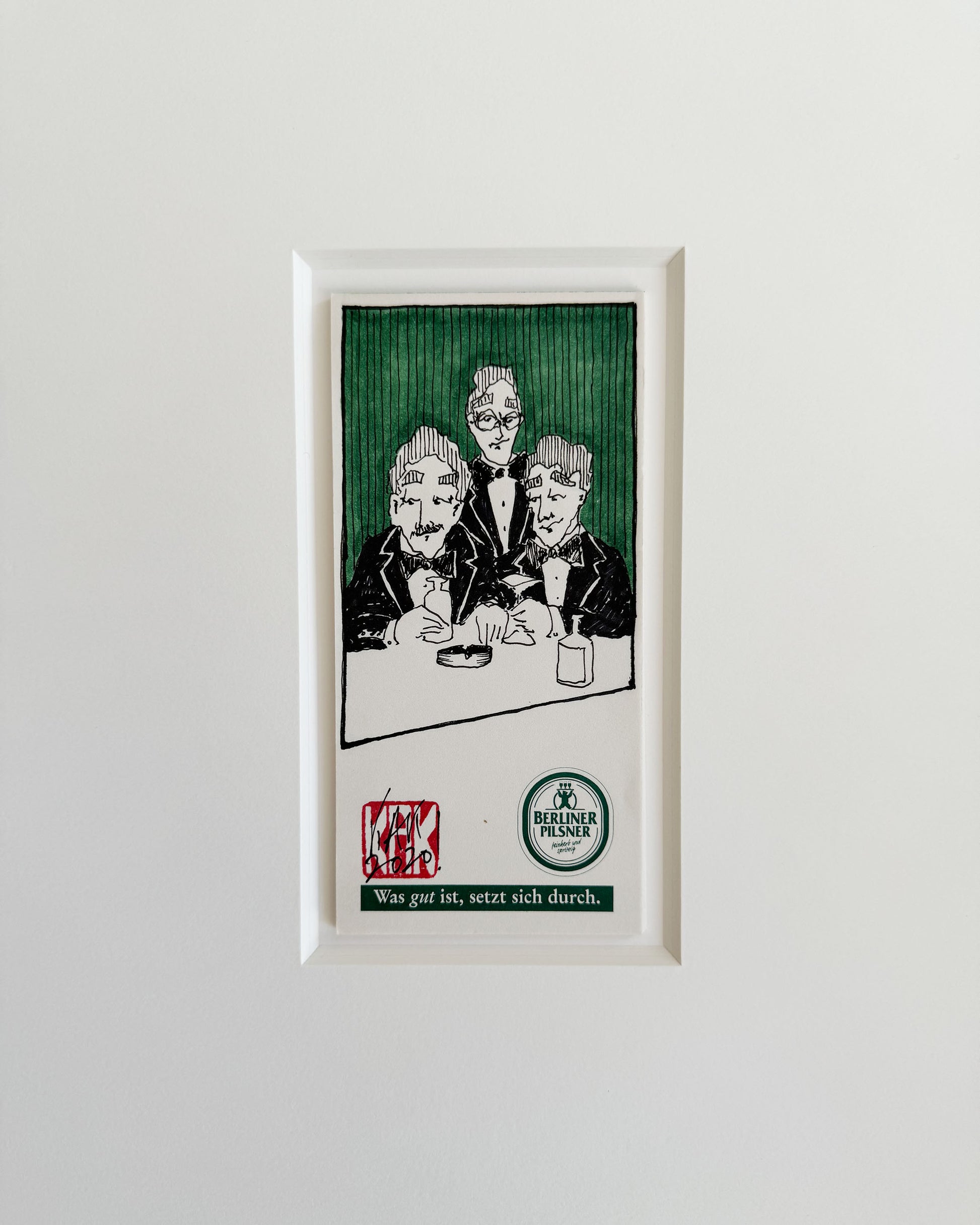 Eine Originalzeichnung von Karl Anton Koenigs. Auf einem Kellnerblock von Berliner-Pilsner.  Eingefasst ist der Kellnerblock in einem 3mm Starken Klapppassepartout in Altweiss mit einer Grösse von 24 x 30 cm.