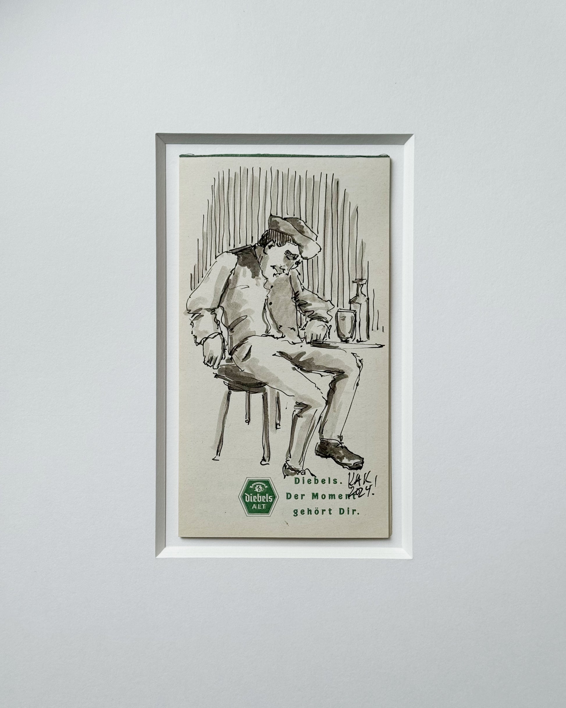 Eine Originalzeichnung von Karl Anton Koenigs. Auf einem Kellnerblock von Diebels Alt. Eingefasst ist der Kellnerblock in einem 3mm Starken Klapppassepartout in Altweiss mit einer Grösse von 24 x 30 cm.