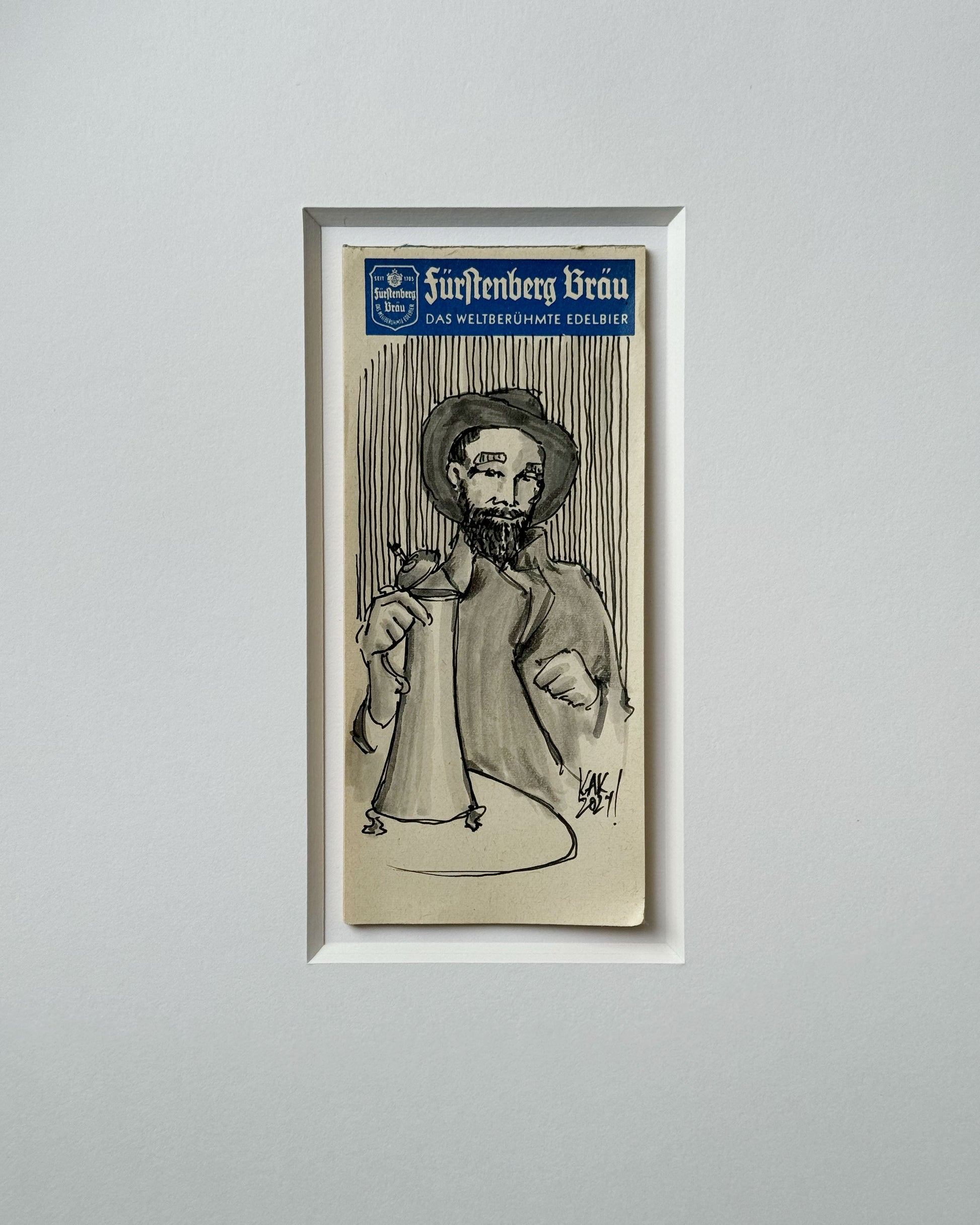 Eine Originalzeichnung von Karl Anton Koenigs. Auf einem Kellnerblock von Fürstenberg Bräu. Eingefasst ist der Kellnerblock in einem 3mm Starken Klapppassepartout in Altweiss mit einer Grösse von 24 x 30 cm.