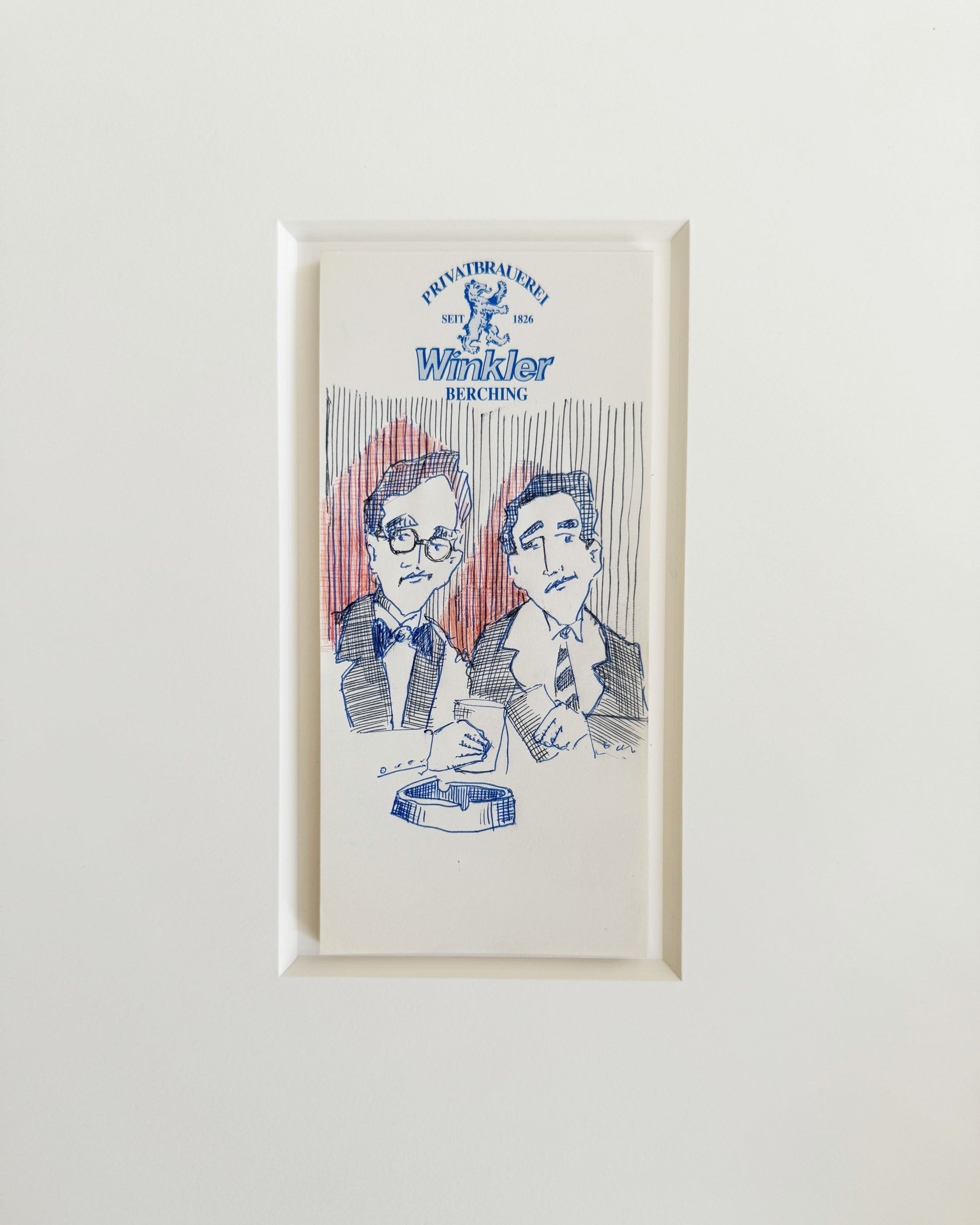 Eine Originalzeichnung von Karl Anton Koenigs. Auf einem Kellnerblock von Privatbrauerei Winkler. Eingefasst ist der Kellnerblock in einem 3mm Starken Klapppassepartout in Altweiss mit einer Grösse von 24 x 30 cm.